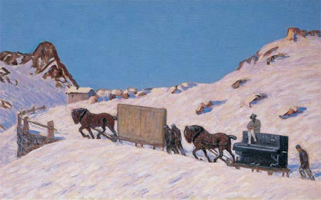 Winterliche Auffahrt des Malers zum Julierhospiz mit Bilderkiste